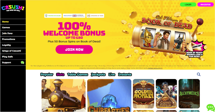 100% Up To £50 + 50 Bonus Spins | Claim Bonus | Offers lots of free spins on Book of Dead The Japanese-themed Casushi online casino rolls out the Tatami mat for Book of Dead fans with 50 free spins on this top Play’n GO slot. You’ll get a 100% up to £50 matched deposit welcome bonus too. A minimum deposit of just £10 is required to participate in the Casushi sign up offer, though you’ll need to wager any bonus winnings 40x before you can cash out. As a long-term player, you can also earn points on the site’s sushi-themed loyalty game, and cash them in for more free spins on Book of Dead. | 18+. New Players Only. Min £10 deposit & wager. Free Spins on Book of Dead (30 spins on day 1, 10 on day 2, 10 on day 3) 1p coin size. 40x wagering applies. Max cash out £250. Bonus expiry 30 days. Bonus spins expiry 2 days. Game restrictions apply. Further Terms Apply. | ![]() | |